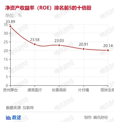 統(tǒng)計(jì)顯示,這14家上市公司最近10年的平均凈資產(chǎn)收益率(ROE)最高的是貴州茅臺,達(dá)33.89%,最低的是東方財(cái)富,只有8.98%。14只十倍股的平均ROE為18.26%,可以說是非常可觀的。從這個角度來看,最近十年ROE始終維持在20%以上的貴州茅臺,的確是不折不扣的賺錢機(jī)器。